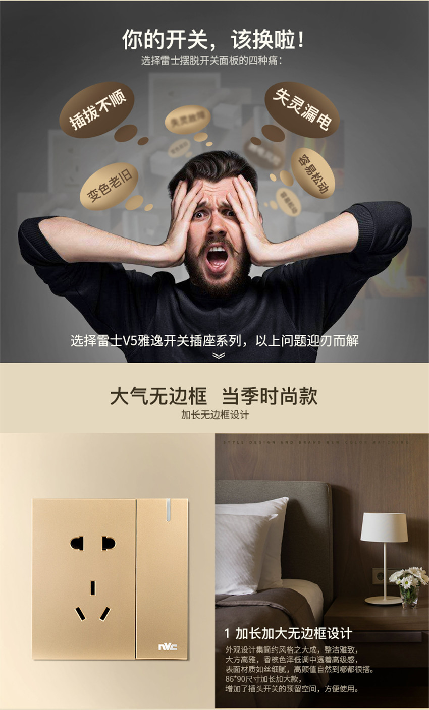 雷士照明開關(guān)插座面板家用電源USB五孔插座86型暗裝面板V5金